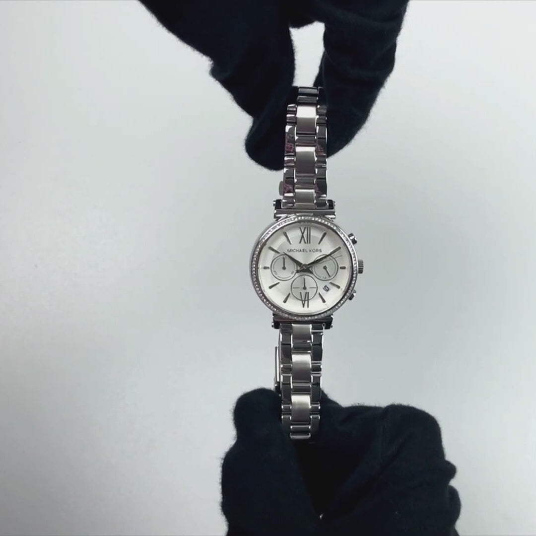 Elevate your style with the Michael Kors MK6575 Sofie Ladies Chronograph Watch, featuring a dazzling crystal-embellished bezel and functional design in silver-tone stainless steel.